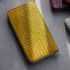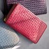 - A sleek zip-around wallet with a hand-woven finish and organized interior—cards, cash, coins, even a phone fit neatly.